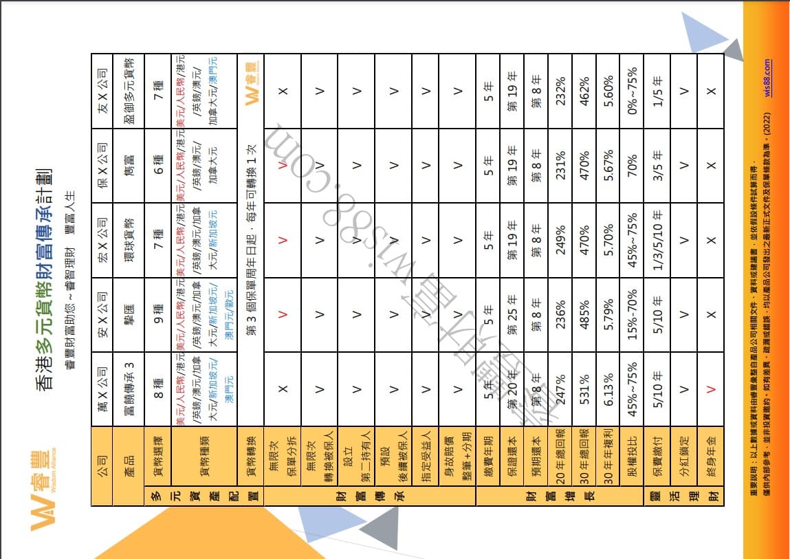 香港保險公司的產品創新,總是配合客戶隨時勢不停變動的理財規劃與時俱進。自多年前推出可無限次數轉換被保人/預設備用被保人/身故理財分期給付....等財富傳承功能後,近一年來,再次為了客戶因應世界局勢而研發保單貨幣轉換,及保單分拆等功能,令客戶的家族於世界各地開枝散葉後,得以更靈活分配財富。目前,香港保單共有5個具備上述多元貨幣的財富傳承計劃。睿豐特別準備了香港多元貨幣財富傳承計劃的產品比較表,讓您一覽盡握最重要的產品資訊,更有效快速的完成產品選擇。歡迎多加利用。
